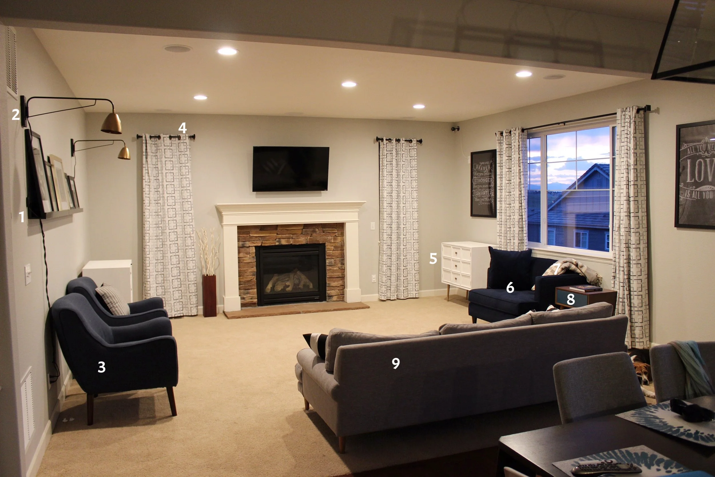 So when we moved in, the whole house essentially was that builder-grade tan/brown thing. We pretty much instantly had the whole first floor painted Stonington Gray and put in recessed lighting. We also scrapped those traditional curtain rods ASAP. It took it from this:
