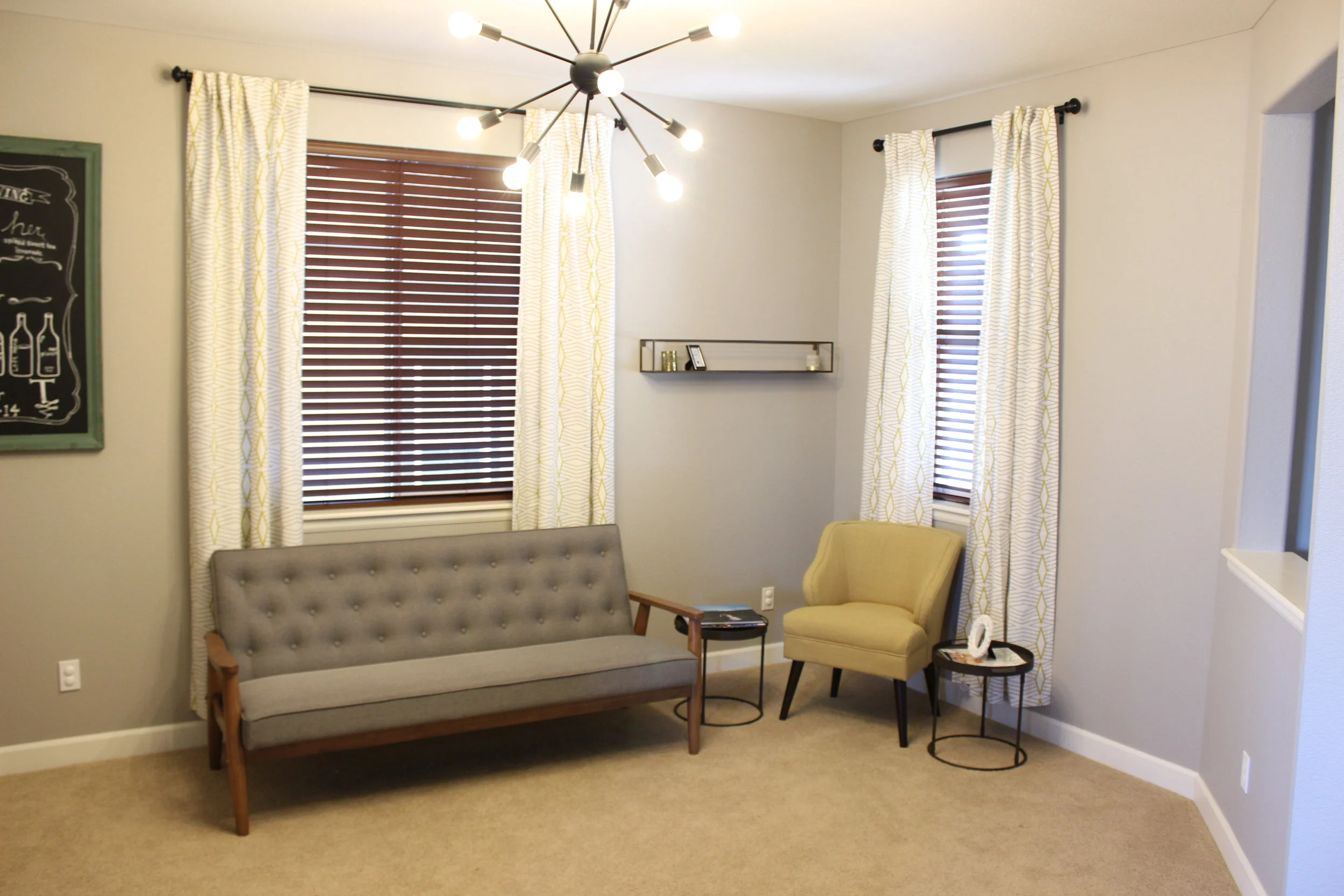 We painted this room Thunder: a slightly darker shade of gray than the Stonington on the rest of the first floor. We added curtains, a couch, a side chair, a bar/credenza, and a new light fixture. And here is where we are currently:
